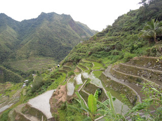 Von Boracay aus sind wir dann Richtung Norden nach Banaue aufgebrochen, um die beruehmten Reisterrassen (UNESCO-Welterbe!) gehoeren. Die Anreise war ziemlich beschwerlich: Flug nach Manila, dann siebeneinhalb Stunden (laut Auskunft der netten Dame am Schalter: fuenf Stunden) in einem Bus, in dem es mal wieder minus 3 Grad hatte. Bei der Ankunft in einer Stadt im Nirgendwo war es dann schon halb eins in der Nacht und damit zu spaet, um weiterzukommen. Also uebernachten und am naechsten Morgen nochmal knapp drei Stunden in einem baufaelligen Jeepney (das sind umgeruestete US-Militaerjeeps, die ueberall auf den Philippinen als Busse eingesetzt werden) auf holprigen Strassen herumgurken. Wenn der Fahrer in den zweiten Gang geschaltet hat, musste er immer den Schalthebel in einer selbstgefertigen Konstruktion festklemmen, damit er nicht wieder rausspringt. Das hat ihn allerdings nicht daran gehindert, ordentlich Gas zu geben. Aber zum Glueck haben weder er noch wir gesehen, wie schnell wir waren - der Tacho stand naemlich immer auf Null...